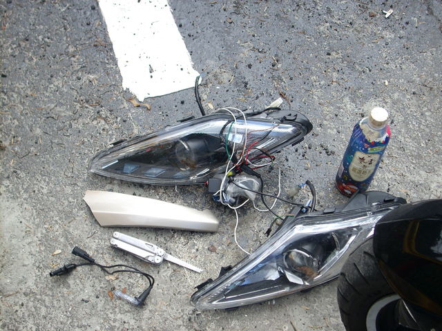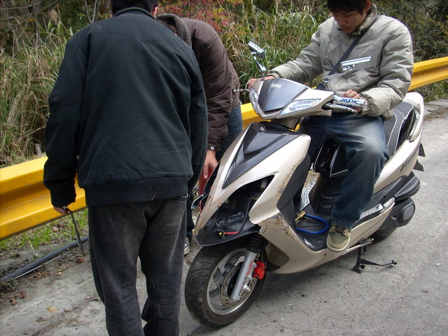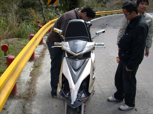 我在地上翻了一下爬起來以後決定先把車子牽到旁邊去檢查,看了一下以後發現我的車摔的比鮪魚的好一點,相同點是大燈壞了,至少車頭沒毀,但比較麻煩的是鎖頭壞了,這下子連發動都不行。其他人繞回來後,看我傷勢不打緊,現在車行也不會開,決定還是先去打球,回來的時候再修。