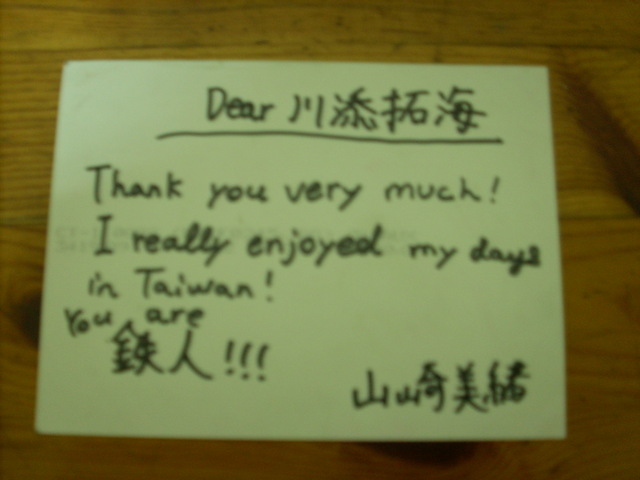 民宿的主人是劉姐,一個漂亮的大姐姐……還是說阿姨?我還是別多嘴了,房間很大也很好,劉姐得知我們有人摔車後首先指出附近哪幾家機車行她很熟以免我們被敲竹槓,還有哪裡的夜市夠熱鬧跟哪邊有表演。我們則是分別洗完澡後放摔車的鮪魚一個人在房裡休息,其他人出門覓食跟問修車零件去。