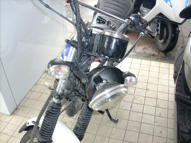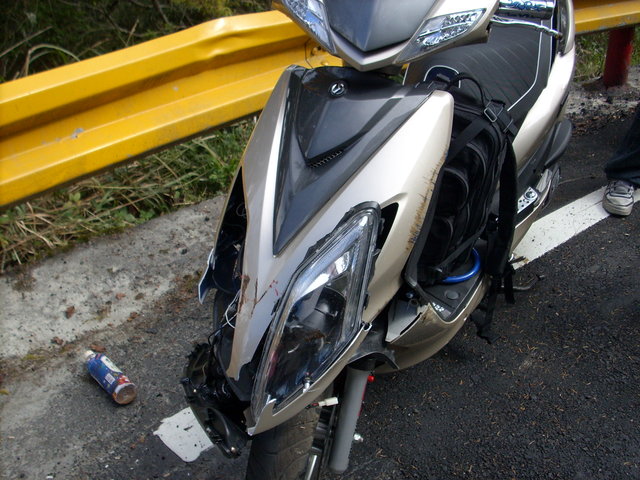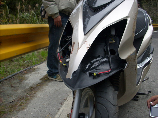 Fighter受損的蠻厲害,車頭幾乎毀了。鮪魚全身上下也有不少擦傷,人車兩傷。不幸中的大幸是,Fighter除了燈組掛掉不能開燈跟車頭毀掉外,還可以騎,而鮪魚也還可以騎車。
